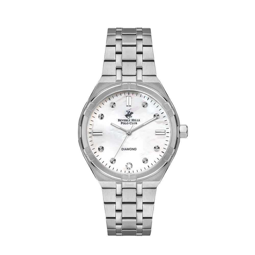 Ženski sat na vrlo atraktivnoj metalnoj narukvici srebrne boje i prirodnim dijamantom na sedefastom brojčaniku. Impersivno.