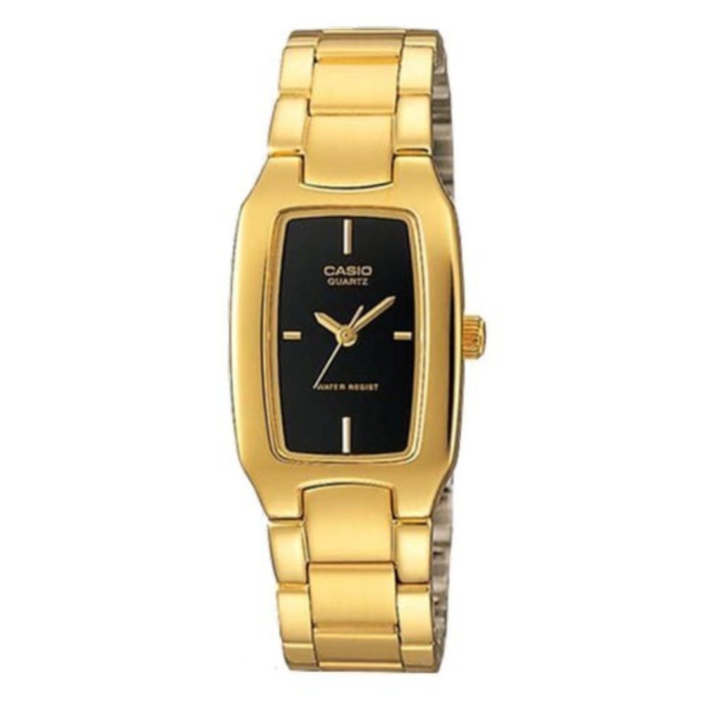 Ženski sat u zlatnoj boji kućišta i narukvice i crnog brojčanika, uvek efektna kombinacija. Prefinjen, ženstven i sa stilom.