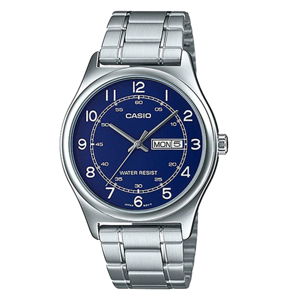 Atraktivan muški sat na metalnoj narukvici srebrne boje i tamno plavim brojčanikom. Vrlo pregledan sa prikazom dana i datuma na poziciji tri sata.