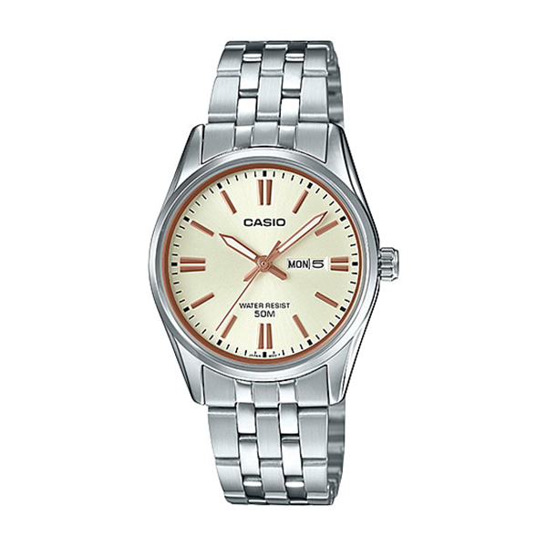 Ženski sat sa prikazom dana i datuma na poziciji tri sata. Atraktivna narukvica od nerđajućeg čelika, brojčanik u zlatnoj boji, sve je skladno posloženo.