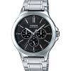 Fascinantan Casio muški sat sa tri podbrojčanika (dan, datum, doba dana) na crnom ciferblatu sa narukvicom od nerđajućeg čelika u srebrnoj boji.