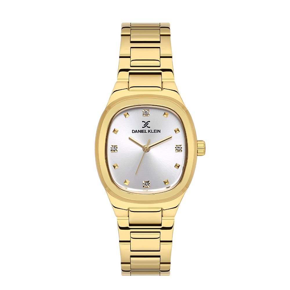 Ženski sat na metalnoj narukvici zlatne boje i ovalnog oblika kućišta.