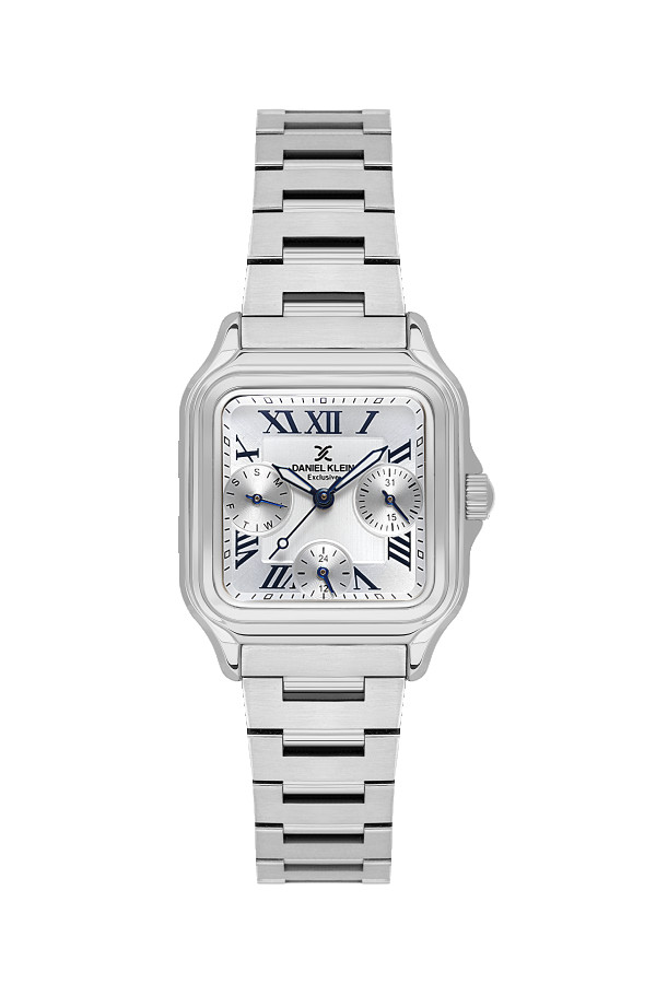 Sat na metalnoj narukvici koja je već sama po sebi ukras na ruci, sa rimskim brojevima i tri podbrojčanika za dan, datum i doba dana.