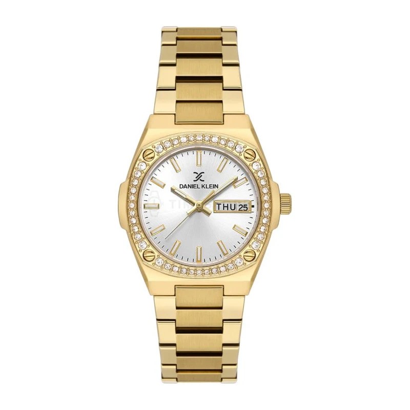 Atraktivan ženski sat u zlatnoj boji sa cirkonima po obodu kućišta. Tu je i prikaz dana i datuma na poziciji tri sata.