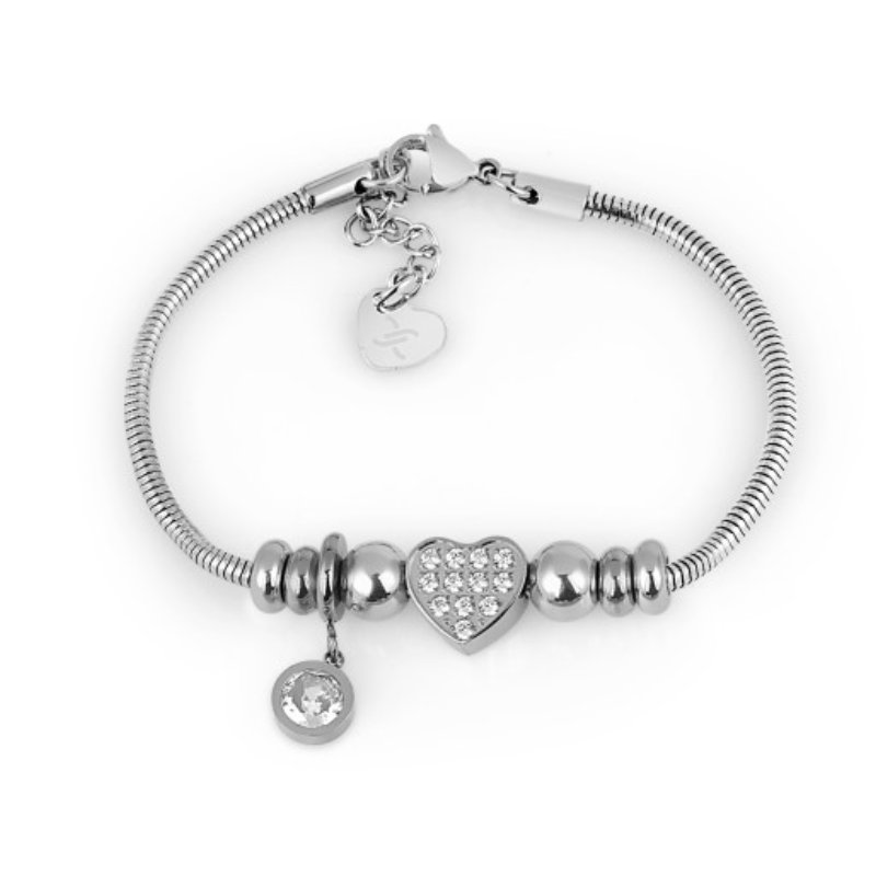 Narukvica u srebrnoj boji od hirurškog čelika sa priveskom u obliku srca ukrašenog cirkonima. Veličanstvena.