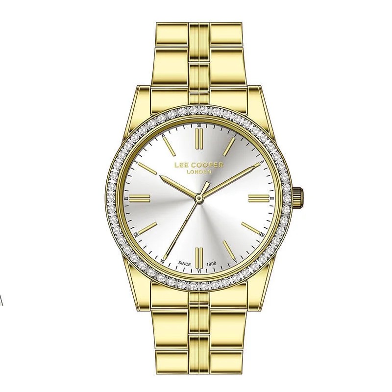 Ženski sat u zlatnoj boji, optočen kristalima po obodu kućišta, optimalnog prečnika. Bez svake sumnje prefinjen.