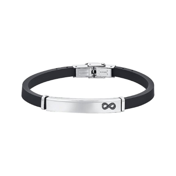 Muška silikonska narukvica u crnoj boji sa simbolom beskonačno na delu od nerđajućeg čelika.