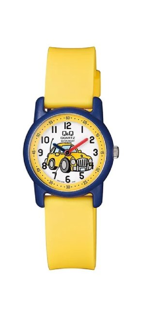 Dečiji sat u kombinaciji plavo žute sa autićem na brojčaniku. Svi brojevi su tu, pa vreme je za prvi sat.